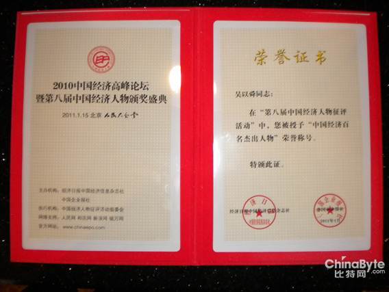 2011年1月15日在北京人民大会堂举办的“2010中国经济高峰论坛暨第八届中国经济人物颁奖盛典”上,第九届全国政协副主席王文元等领导出席了颁奖盛典,并向获奖者颁发了荣誉证书。