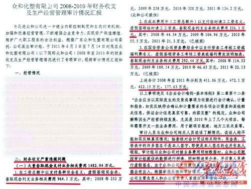 “在审计结束后,我们审计部在审计汇报中特别向茂名石化公司作了说明。”作者在帖子中说。其提供的一份“众和化塑公司2008-2010年财务收支及生产经营管理审计情况汇报”文件复印件明确指出,众和公司存在财务收支严重违规问题。