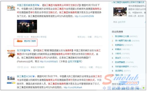 2012年7月7日中午,一则“徐工集团与施维英公司举行交割仪式”的微博成为工程机械行业的热门话题,这是继中联重科收购CIFA、三一重工收购普茨迈斯特之后该行业的又一重要事件,标志着中国工程机械龙头企业“三国演义”的竞争格局进入新的阶段。根据新浪微博检索结果,最早在微博传播该新闻的是中国工程机械信息网官方微博,成为全球微博首播。截止7日晚间,该微博消息已被转载89次,评论17次,入选新浪官方推荐热门微博。由于该微博是在行业人士之间进行传播,受众更加精准,随着粉丝2次、3次、N次的转发和评论,粉丝间的互动以几何级数般递增,传播力度更强。专家认为,随着微营销时代的到来,以微博营销为基础的精准营销模式成为企业的竞争利器。而热门行业事件通过微博的传播互动,微博已成为传播行业资讯的重要平台,标志着以社会化媒体为平台的微博时代资讯传播模式进入了新的阶段。