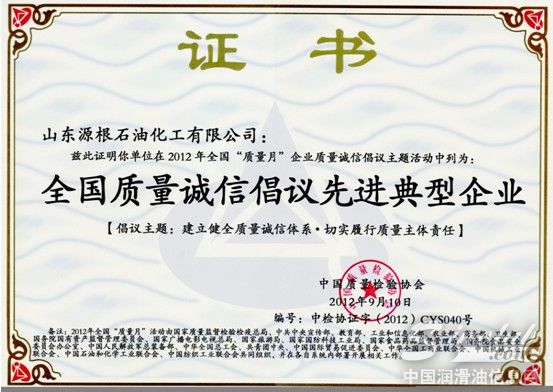 近日,山东源根石油化工有限公司荣获由中国质量检验协会颁发的“全国质量诚信倡议先进典型企业”荣誉证书。据悉,2012年全国“质量月”活动由国家质量监督检验检疫总局、中共中央宣传部、教育部、工业和信息化部、农业部、商务部、中华全国总工会、中国人民解放军总装备部、共青团中央以及中国国际贸易促进委员会等国家21部委共同组织,并在各自系统内部署开展相关工作。