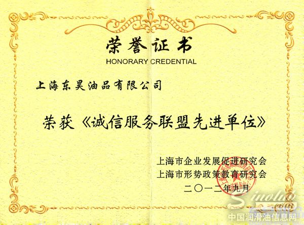 上海东昊油品荣获“诚信服务联盟先进单位”