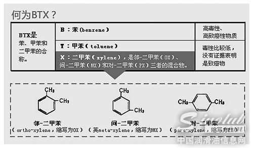 以PX为代表的芳烃产业和以乙烯为代表的烯烃产业,是石油化工的“两大家族”。芳烃类家族包括苯、甲苯、混合二甲苯、邻二甲苯、对二甲苯和重芳烃等。有人把PX和苯混为一谈,其实,二者有很大的区别。苯是一种毒性很强的物质,客观上讲PX有一定毒性,但毒性要比苯小很多。