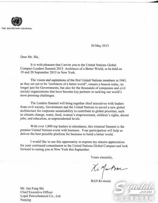 在此之前,5月30日,联合国秘书长潘基文向我公司石俊峰总经理发来了亲笔邀请函,邀请龙蟠石化作为全球契约在中国的杰出成员代表,参加本次以“建设更美好的世界"为主题的峰会。