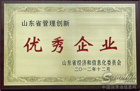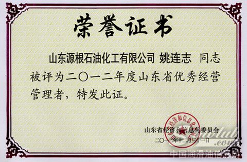 在山东省经济和信息化委员会举办的2012 年度山东省企业管理创新工作评选中,源根石化公司被授予“山东省管理创新优秀企业”称号,公司董事长姚连志荣获“山东省优秀经营管理者”称号。