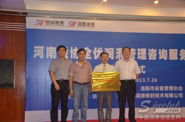 根据河南省设备管理协会豫设【2013】12号文件,为了进一步推进河南省设备管理事业的发展,发挥高新技术企业引领作用,做好政企服务和对接的纽带与桥梁,依托洛阳润邦润滑密封技术有限公司成立河南省设备管理协会全优润滑管理咨询服务中心,授牌仪式于2013年7月26日在洛阳新友谊大酒店隆重举行,河南省设备管理协会会长张根山、秘书长程平、副秘书长藏义明、办公室主任耿浩、洛阳市设备管理协会会长李书良、秘书长陈生龙、办公室主任张珺然、顺益体系总裁张建新、顺益体系市场部总监张志翰、西班牙老鹰中国代表处西北大区经理孙峰、洛阳润邦常务总经理兼全优润滑管理咨询服务中心主任谭江平、洛阳润邦市场部经理兼中心副主任张正华、河南省数十家企业、一百五十余名设备中高层管理人员出席仪式。