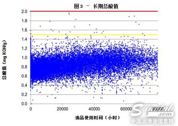 如图 3 所示,埃克森美孚对测试结果进行了分析,表明在产品超长的服务周期过程中(3-5 年), 总酸值比最初的 0.9 mgKOH/g 几乎没有增加(因为测试的变化性,所以出现了一些分散数据)。这表明美孚齿轮油™ SHC XMP320 的使用寿命未受风机齿轮箱运行的影响。