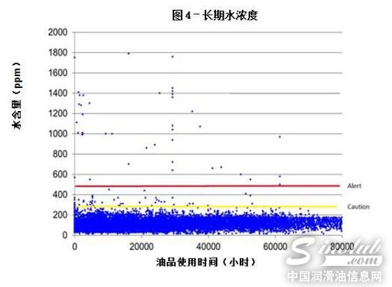 水是一种极具相关性的污染物,因为其存在可能导致添加剂消耗、粘度下降和元件腐蚀。图4说明了油品中长期 水含量。油品中极低的水含量保证了不 存在游离水,因此防止了潜在腐蚀磨损。这表明该美孚齿轮油™ SHC XMP320可有利于减少停机时间,并延长使用时间。