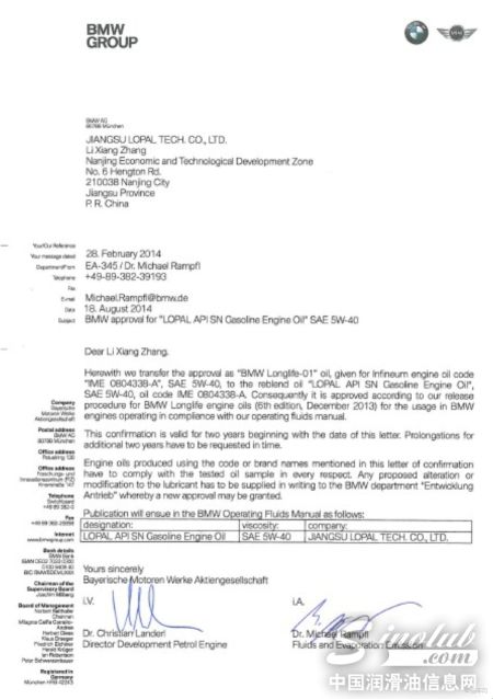 据了解,龙蟠至尊SN的样品是在今年2月份送往德国宝马总公司进行认证工作的。此产品在宝马的各型号发动机上进行了长达半年的行车实验,实验结果表明,该产品的各项性能指标完全符合宝马总部最新颁布的《宝马长寿命发动机油标准》,完全适用于宝马各种车型以及MINI系列。