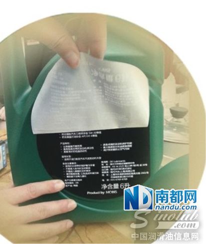 夏先生说,他当时发现不对劲后,马上拿起瓶身仔细检查。他发现,在这瓶写满中文说明的6升润滑油瓶身上,贴了两层中文标签。两层标签贴得严丝合缝,不仔细查看根本发现不了。夏先生说,当他揭开第一层标签纸后,发现下面还有一层标签,同样也是中文说明,唯一不同之处在于上面一张标签注明的性能等级是“符合欧洲汽车制造协会A C E AB 3/B 4”,下面一张标签注明的性能等级是“符合美国石油协会A PI C H -4等级”。