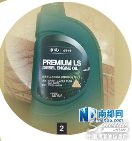 当工作人员将两瓶润滑油加到车内后,夏先生拿起瓶身查看时却发现了不对劲的地方。两瓶润滑油的外包装有明显差别。夏先生说,1升装的小桶润滑油的外包装前后都是韩文,直接印在瓶身上,上面还贴了一张黄色标签,用中文注明了产地及产品名字;而6升装的大桶润滑油却没有韩文字样,只在瓶底印有韩文名称及电话,瓶身正面只有中文“进口起亚纯正润滑油”几个大字,瓶身反面也全是中文注明的产品信息和地址。