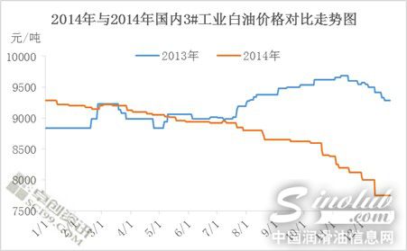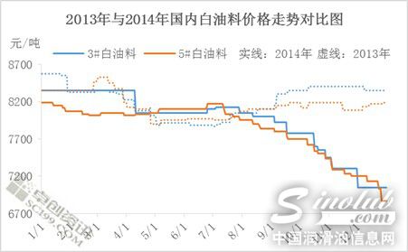 白油市场季节性需求较为显著,一般进入夏季后,下游需求增加将支撑价格上行,2013年白油料与白油均维持正常价格趋势,7-11月震荡上行,进入冬季后需求转淡,价格再适度下滑。而自2014年开始,价格走势打破以往惯例,与上游原料下滑、周边市场波动、下游需求疲软等各方面因素均脱不了干系。