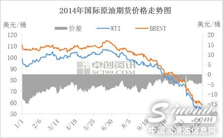 原油期货的下跌,在1-2个月后逐步反映到白油市场中来,上游炼厂原料成本下滑,对于炼厂生产利润的回升是利好消息,然而前提是销售过程顺畅。由于市场环境欠佳,白油市场2014年以来需求始终维持疲软状态,炼厂出货欠佳,多数库存高企。因此,销售受阻结合原料价格下跌,白油价格尾随国际油价下跌,跌势一发不可收拾。自上表可以看出,原油期货年均价同比下跌,白油市场主要型号也存在3.70%-4.53%不等的跌幅。