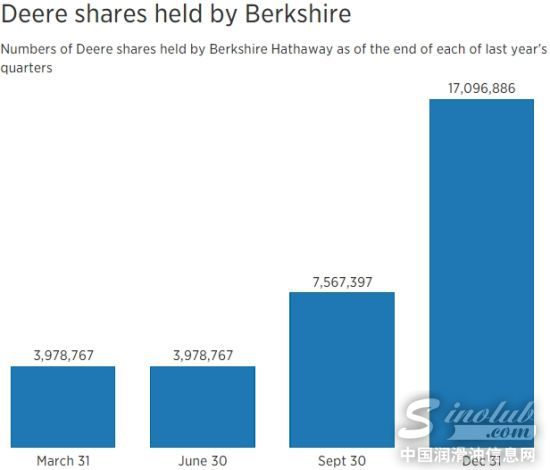 北京2月20日上午消息 去年下半年巴菲特的伯克希尔哈撒韦公司大举增持Deere&Co.的股票,增持是秘密进行的直到今天才公布,Deere的股价在去年第四季度上涨了12.6%。