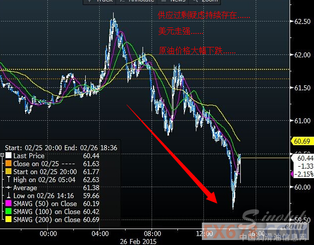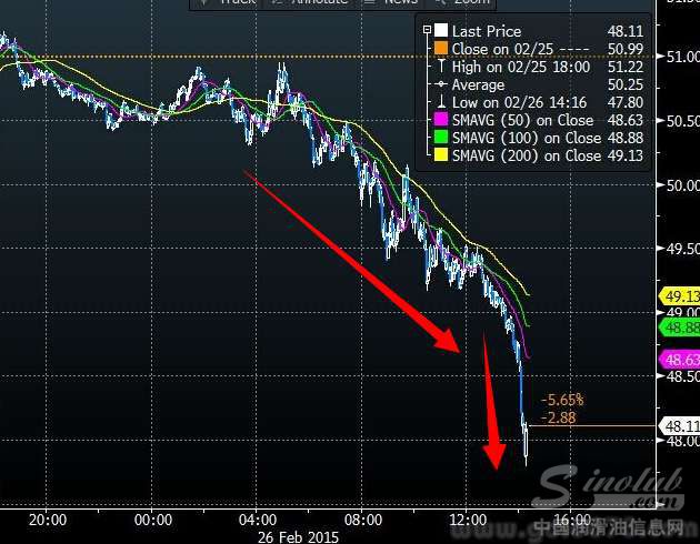 美国NYMEX 4月原油期货价格周四(2月26日)收盘下跌2.82美元,跌幅5.53%,报48.17美元/桶,创将近以一个月以来最低收盘位,尾盘时段一度跌破48关口并刷新日低至47.80美元/桶,在供应过剩疑虑持续存在和原油库存刷新纪录高位之际,美元走强让原油市场的处境雪上加霜。