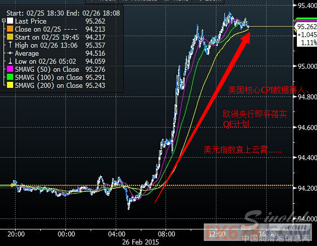 周四稍早发布的通胀率和耐用品订单等经济数据整体上喜人,投资者还将注意力放到欧洲央行(ECB)即将从3月份开始实施量化宽松(QE)政策这件“盛事”之上,使得欧元兑美元节节败退,刷新日低至1.1184、并试图下测1月26日所创1.1098这一12年(2003年8月份以来)最低位,美元指数趁机上涨至95.357,这无疑让以原油为首的大宗商品市场如履薄冰。