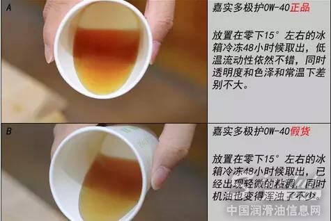 冷冻48小时候,正品机油会表现出不错的低温流动性,同时透明度和色泽没有明显变化,而假货机油则会出现轻微的粘稠,并且出现浑浊状态。(品牌仅作对比,不做为产品推荐)