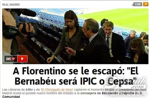 IPIC是“国际石油投资公司”(InternationalPetroleum Investment Company)的简称,隶属于阿布扎比政府,性质接近于主权财富基金。日前,皇马刚刚与IPIC签订了一份为期五年的合作协议,官方将其称为 “将俱乐部国际化同时将圣蒂亚戈-伯纳乌球场变成世界最佳体育场馆的途径”。