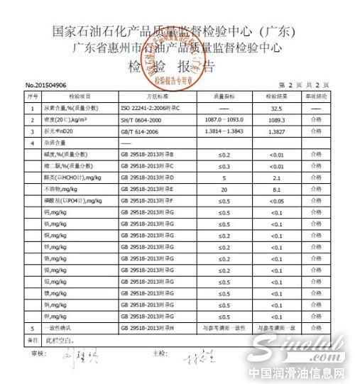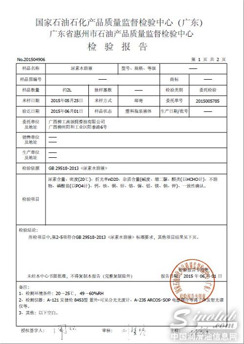 目前,“驭蓝柴油尾气处理液”已经通过了第三方--国家石油石化产品质量监督检验中心(广东省惠州市石油产品质量监督检验中心)的检测,其中多个检测项目包括:密度、折光度、碱度、缩二脲含量、醛类指标、不溶物含量、磷酸盐含量,检测出来的指标都远远低于国家规定标准,其他的重金属铝、钙、钾、钠、铜、铁、镁、镍、锌、铬都均未检测出来,就连红外定性也与标准谱图一致,相关技术指标均符合国家GB 29518-2013《尿素水溶液》的严格标准,最后“驭蓝”顺利地拿到了合格的检测报告。