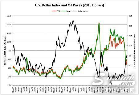 美元与油价存在反向关系是因为全球原油交易是以美元进行的。这意味着,当美国经济增长,油价就会下跌。