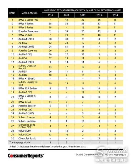 这份榜单是《消费者报告》对50万辆2010至2014款车型的车主进行调查后得来,榜单中30款车型的机油消耗量远高于同期车型的平均水平,表格中的数字代表该车型每次更换机油时需要添加1夸脱(注:是个容量单位,主要在英国、美国及爱尔兰使用,将近1升)机油的车辆占比。数字越大,代表该年款车型的机油消耗量越高。