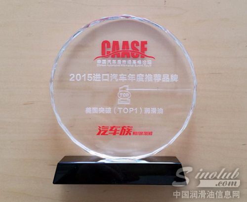 美国突破(TOP1)润滑油在汽车族2015中国汽车后市场评选中再次获得中国汽车后市场“2015进口汽车年度推荐润滑油品牌”,连续三年获得汽车后市场十大推荐品牌。历届中国汽车后市场十大推荐品牌涵盖了润滑油、轮胎等汽车后市场国际一线品牌,是一...