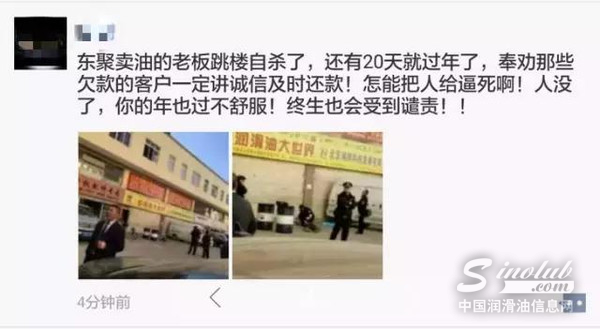对润滑油经销商而言,别人向他们赊账容易,他们向别人收款却难于上青天。前段时间,机油猫(m.sinolub.com)就在朋友圈看到这样的一条噩耗:一个经营润滑油的老板因为欠款难以回收以及债务问题,而最终选择了跳楼自杀,彼时距离中国的传统节日春节还不到20天的时间……