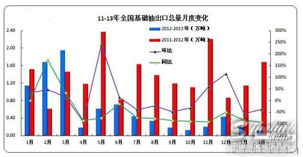 据中国海关总署统计数据显示,2013年2月份中国基础油出口量为0.12万吨,较1月环比走跌36.84%。与去年同期相比,大幅下跌,跌幅为92.85%。受春节小长假的影响,二月份整体市场更显低迷,市场成交持续下滑,二月份国内出口总量也因此受到不小影响。