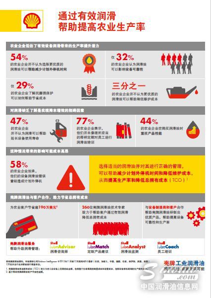 壳牌润滑油委托某市场调研机构针对亚洲、欧洲和美洲等8个国家的120位涉及购买、影响购买或使用润滑油/润滑脂的农业企业员工进行的调查表明,大多数农业企业低估了其润滑规程对收割季节设备可靠性的影响。仅39%的农业企业清楚有效润滑管理可以影响非计划停机时间,仅29%的农业企业认识到润滑油可以通过增强抗磨损保护帮助降低成本。