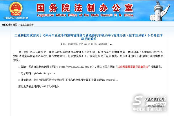 6月13日,国务院法制办办公室网站发布《工业和信息化部关于<乘用车企业平均燃料消耗量与新能源汽车积分并行管理办法(征求意见稿)>公开征求意见的通知》,自即日起至6月27日,《乘用车企业平均燃料消耗量与新能源汽车积分并行管理办法(征求意见稿)》公开征求意见。