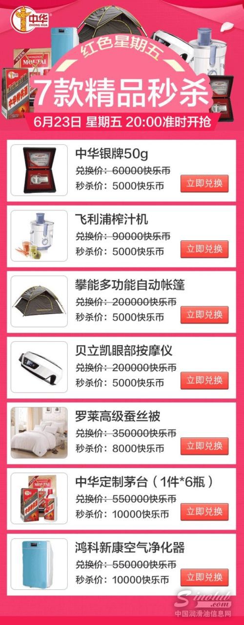 除了上面说的那些当即能兑现的好处,中华润滑油“快乐币”还推出了超值新玩法:每逢周五20:00,中华润滑油在其微信公众平台的“技师中心”,都会推出“红色星期五秒杀活动”。只需持有少量的快乐币,就能秒到超值200倍的礼品。