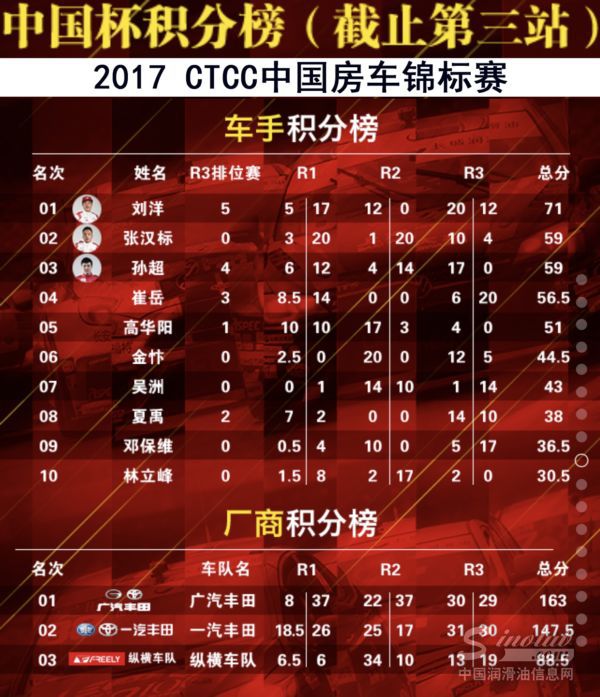 本站比赛中,广汽丰田车队依然全程使用力魔特技AA 0W-20润滑油参赛,凭借发动机强劲动力输出顺利收获首回合冠军、次回合冠亚季军奖杯,创造本赛季最佳成绩。车队现以总积分226分位列厂商积分榜榜首,车手刘洋也以110分的总成绩保持车手积分榜领先。