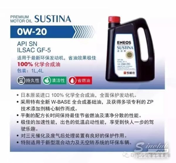 ENEOS引能仕的原装进口SUSTINA速驰耐系列SN/GF-5 0W-20机油,它的粘度指数惊人地达到了231,是润滑油业界粘度指数的技术标杆。低粘度机油性能的耐久性不亚于高粘度机油,产生的阻力更低,能最大限度地发挥发动机的性能,还能带来燃油经济性,是环保的趋势,也是节能的未来!