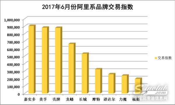 据机油猫数据显示,2017年6月份,“嘉美壳”在交易指数(涵盖订单数、买家数、支付件数、支付金额、加购、收藏、转化率、点击率、访客数等核心指标,不等同于交易金额)上以绝对的优势牢牢占据机油行业的前三名。中国品牌龙蟠、长城位居第四、第五名。摩特、道达尔、力魔等国内外名牌则紧随其后,知名国际品牌福斯也跻身前十。