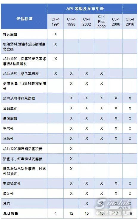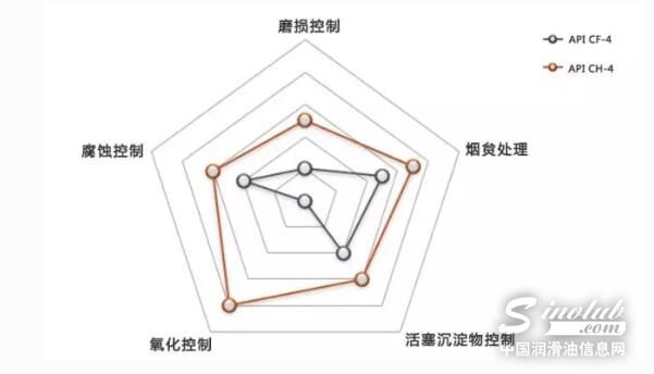 如果不去看硬件的升级变化,而仅仅看油品质量本身,API CF-4和API CH-4油品总体上可以从磨损控制、烟炱控制、活塞积炭控制、氧化控制和腐蚀控制上进行性能上的比较。如图所示,根据领先的润滑油添加剂公司路博润的解读,CH-4油品不仅仅在各方面的性能都全面强于CF-4之外,更是在CF-4的基础上提出了氧化控制方面的要求。
