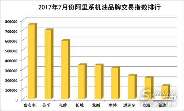 据机油猫数据显示,2017年7月份,“嘉美壳”在总体交易指数上依然一枝独秀,以两倍左右的差距甩开其他对手。长城、龙蟠、摩特、道达尔、力魔等国内外名牌则紧随其后。