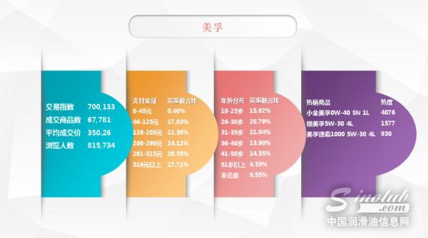 随着润滑油电商市场的不断发展,越来越多的用户选择通过电商平台购买心仪的润滑油产品。据首席正品机油电商导购平台机油猫(m.sinolub.com)的统计,2017年7月份,阿里系平台访客数为358万人次,浏览量为2016万次,成交33.57万件,平均成交价格295元。相较往前数月,本月各项数据均出现了下滑。据分析,消费者借上月“6·18”电商节“囤货”是主要影响因素。