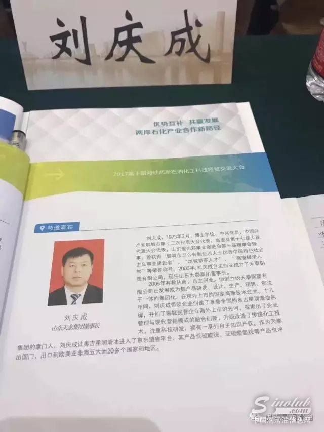 2017年8月24号,在有中共中央、国务院台办副主任郑栅洁,河南省人民政府副省长舒庆,中国石油和化学工业联合会会长李寿生、台湾石化同业公会理事长林福伸以及濮阳市市委市政府参与的第十届海峡两岸石化经贸交流大会上,全国润滑油企业联盟副主任委员(右二)山东天泰钢塑、奥吉星润滑油董事长刘庆成先生与台聚、台湾李长荣公司李启志副总裁等海峡两岸企业家分享企业科技创新和可持续发展经验!