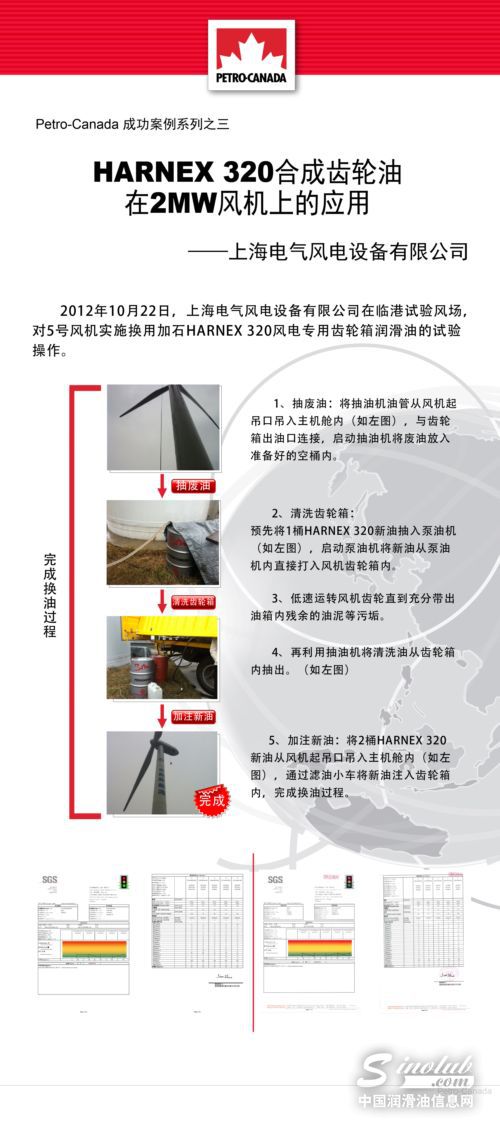 2012年10月22日,上海电气风电设备有限公司在临港试验风场,对5号风机实施换用加拿大石油HARNEX 320风电专用齿轮箱润滑油的试验操作,取得了圆满的成功。在此次合作中,加拿大石油的专业表现赢得合作方的高度赞赏,也成为加拿大石油在华经典服务案例之一。上海电气风电设备处评价道:“自从用了加拿大石油HARNEX 320,在这五年左右的时间里,设备一直正常运行,减轻了我们的维护工作,提高设备运行效率,大大降低了成本。”