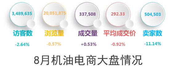 随着润滑油电商市场的不断发展,越来越多的用户选择通过电商平台购买心仪的润滑油产品。据首席正品机油电商导购平台机油猫(m.sinolub.com)的统计,2017年8月份,阿里系平台访客数为350万人次,浏览量为2005万次,成交33.75万件,平均成交价格292.33元。相较上月同期,本月除成交量外的各项数据均出现了小幅下跌。