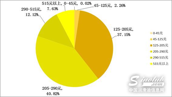 在价格方面,机油猫数据显示,近八成消费者支付的价格集中在125-205元和205-290元之间。