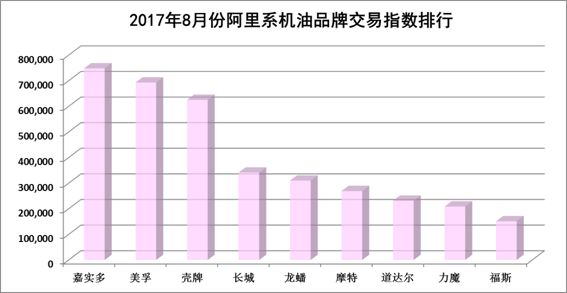 据机油猫数据显示,2017年8月份,“嘉美壳”在总体交易指数上依然一枝独秀,以两倍左右的差距甩开其他对手。长城、龙蟠、摩特、道达尔、力魔等国内外名牌则紧随其后。