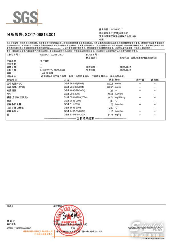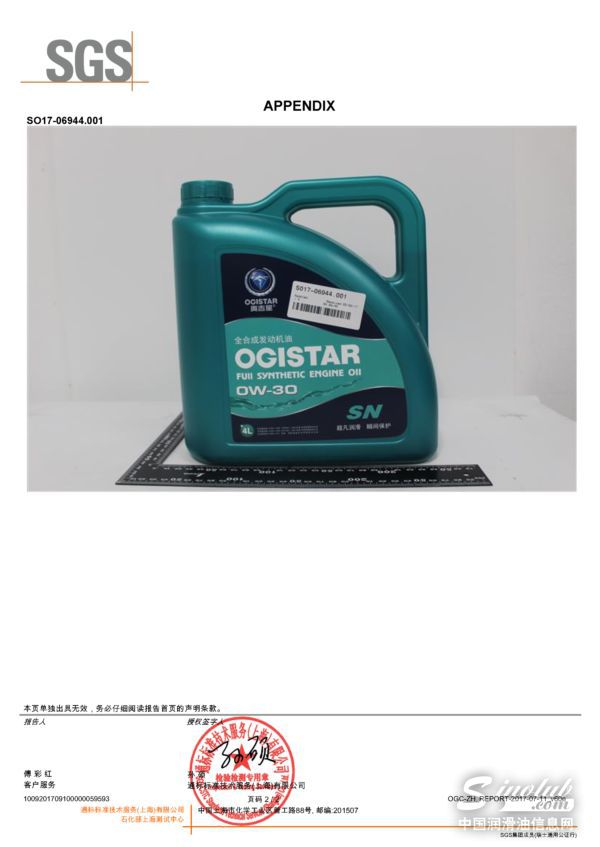 奥吉星全合成汽油机油SN 0W-30检测报告