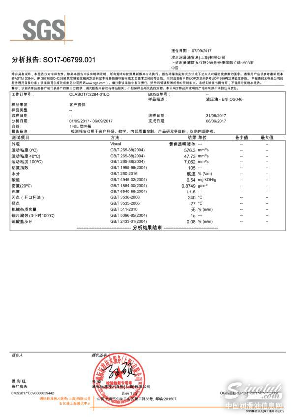 埃尼ENI SOS46液压油检测报告