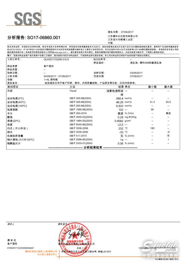 江苏高科石化46#抗磨液压油检测报告