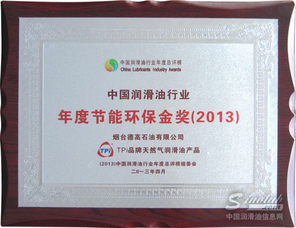 2013年,泰普艾品牌天然气润滑产品凭借高效节能、环境友好的特性,获得“中国润滑油行业年度节能环保金奖”。
