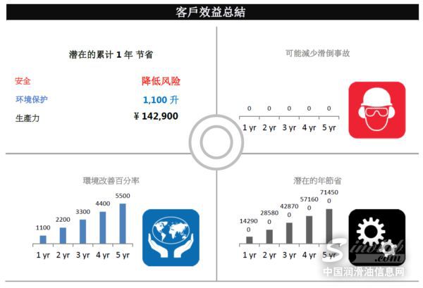 其中,设备补油次数从原来的一年5次减少到3次,以每套设备每次补油需要0.2小时的人力成本计算,一年可减少工人与油品的接触时间40小时;而节省的1100升导轨油每年可为企业节省22,900元。更重要的是,在设备加工精度提升后,每年预计可增加合格产品100件,按市场价平均每件1200元计算,每年可增加效益人民币120,000元!