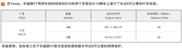 在美国德克萨斯州,乐威路V7用两年时间在“马克(MACK)”两个车型的12辆车上进行了长达8万公里的行车实验,证明了在标准工况下乐威路V7 可达70000KM的超长换油周期,是混合车队的理想选择。