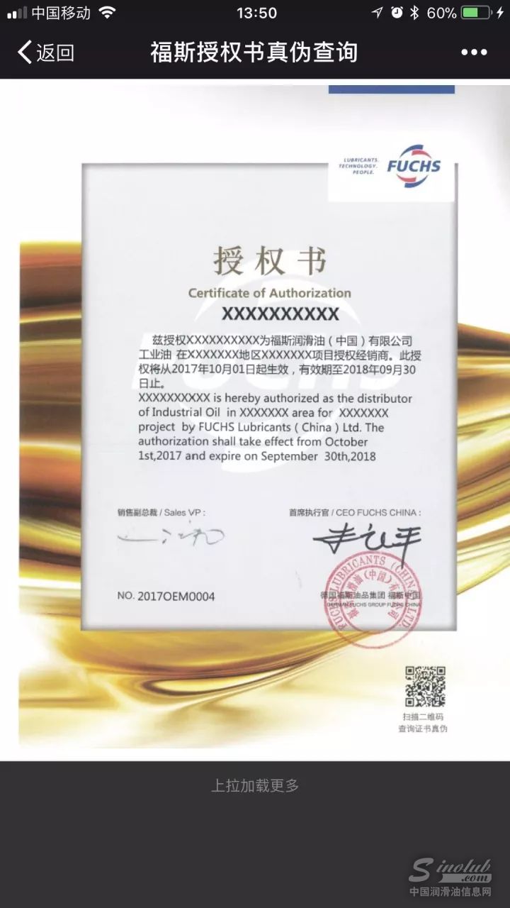 尊敬的福斯润滑油经销商:今年以来,由于在业务拓展中,不断收到有关伪造经销商授权证书的投诉,现公司对目前的经销商证书签发程序进行升级,未来将通过网上系统进行授权证书的签发,并采用唯一的二维码进行防伪。该证书的签发预计在2017年10月1日起正...