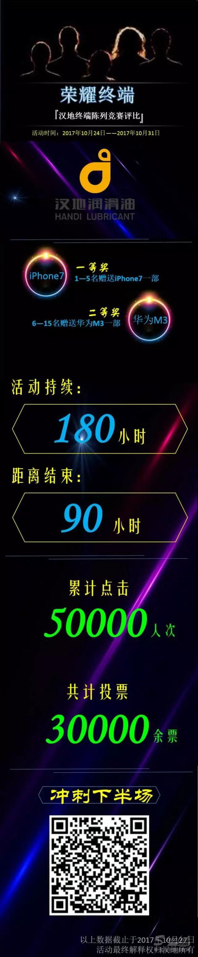 苹果手机or华为平板?你来决定!十月金秋,是收获的季节,汉地润滑油在Q3隆重举行的终端陈列竞赛也进入到最后的收获环节,谁将是汉地最美门店?谁又能拔得头筹?苹果手机or华为平板?全部由你来定!自10月24日零时正式上线开始,汉地终端陈列H5评...