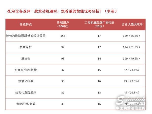 在为设备选择一款发动机油时,最看重的性能优势的调研中,200位工程机械终端用户有152位都选择了“较长的换油周期”及“燃油经济效益”,97位选择了“抗磨保护”和“清洁性”,仅有39位用户选择了“耐高温”、“抗氧化”、“低温流动性”及“抗乳化及防泡沫”等具体的性能特点。